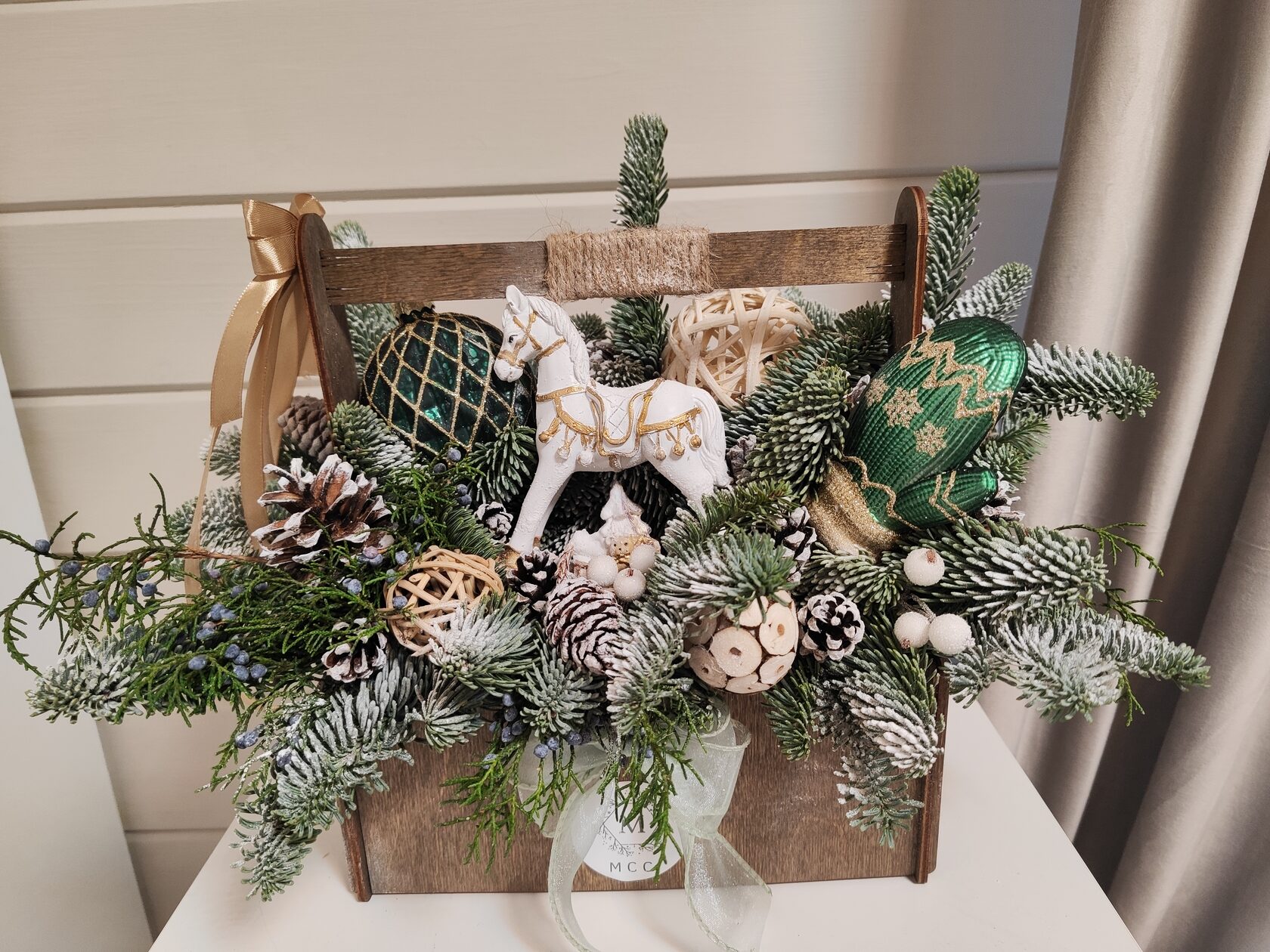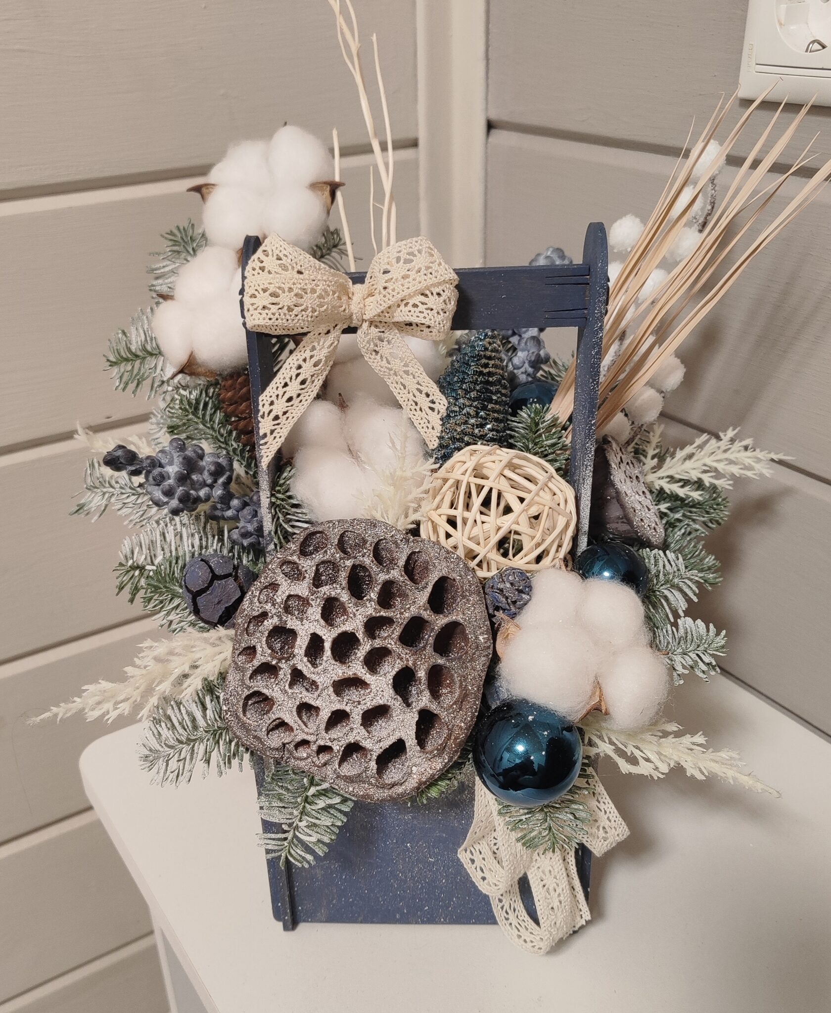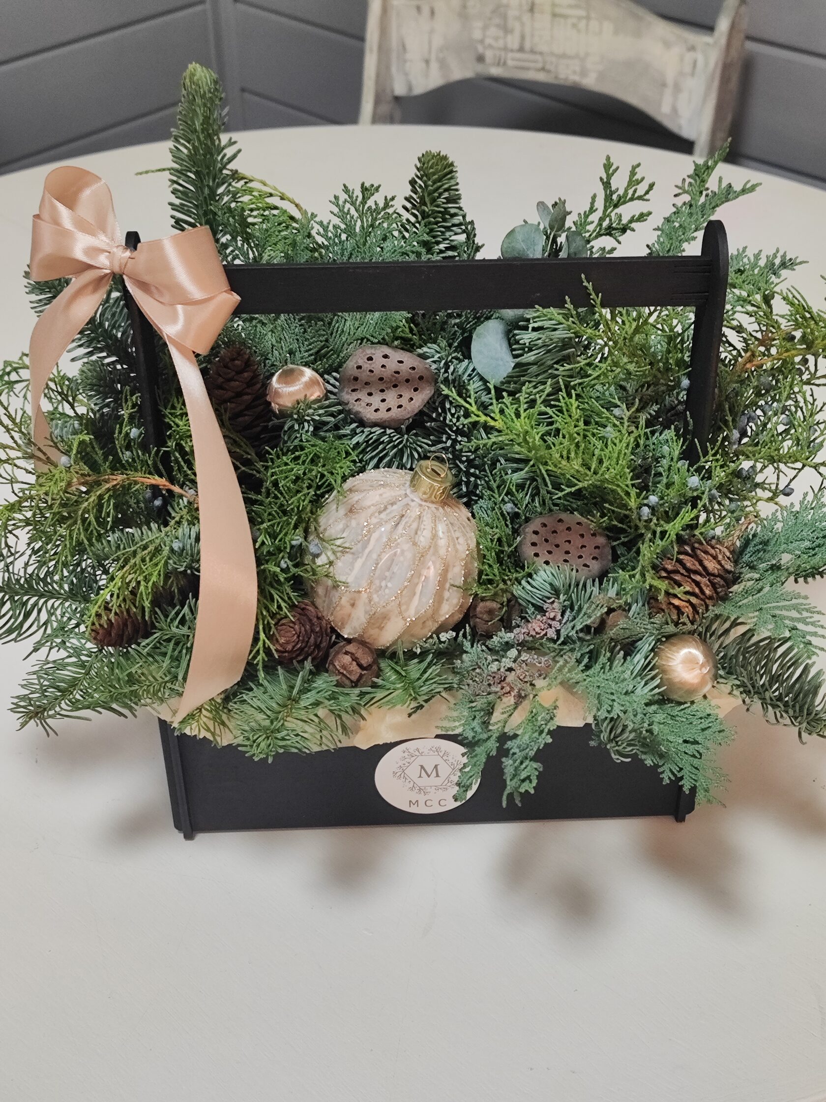 Композиция из веток сосны в деревянном ящике 60*40,высота 40см