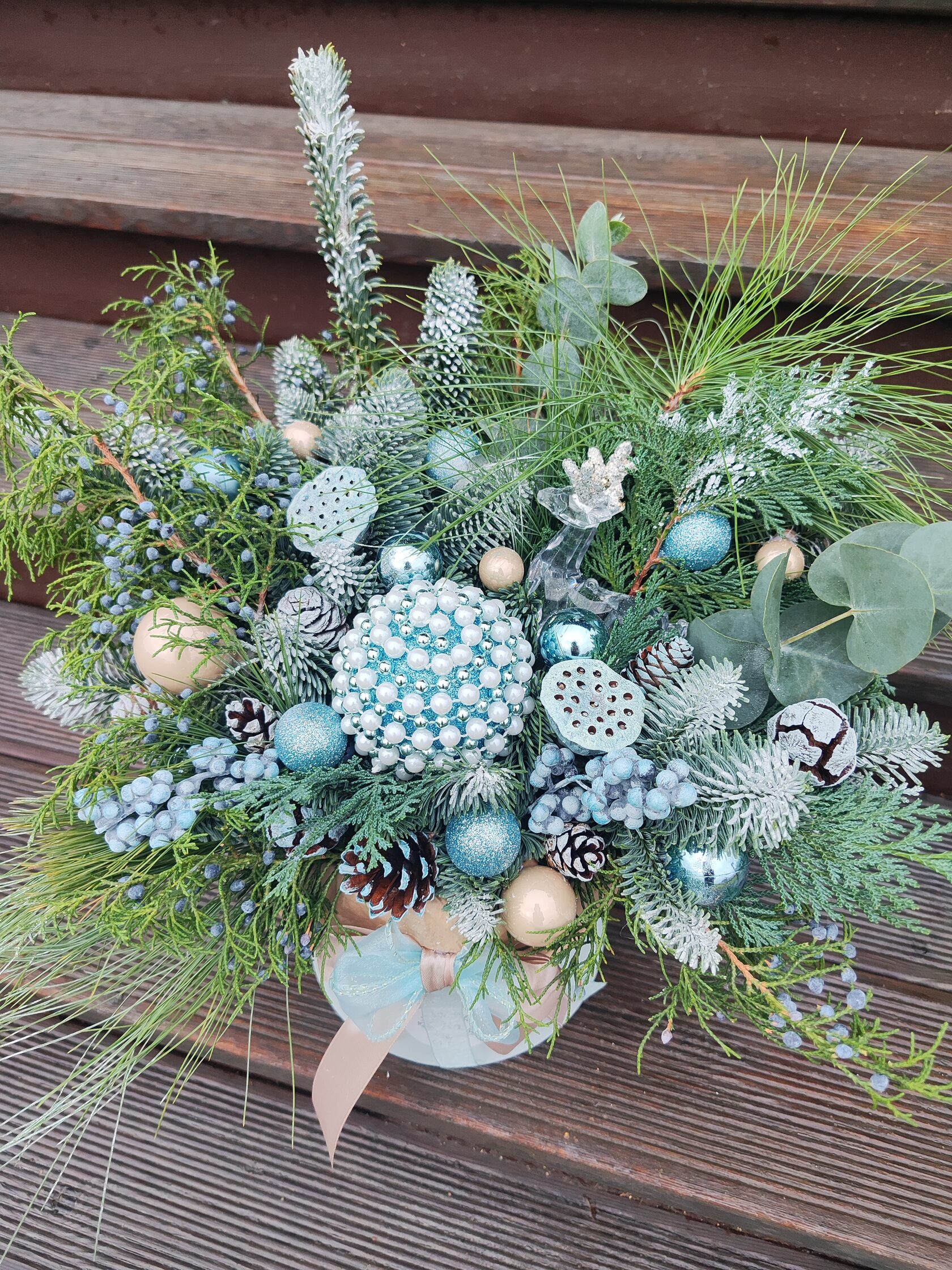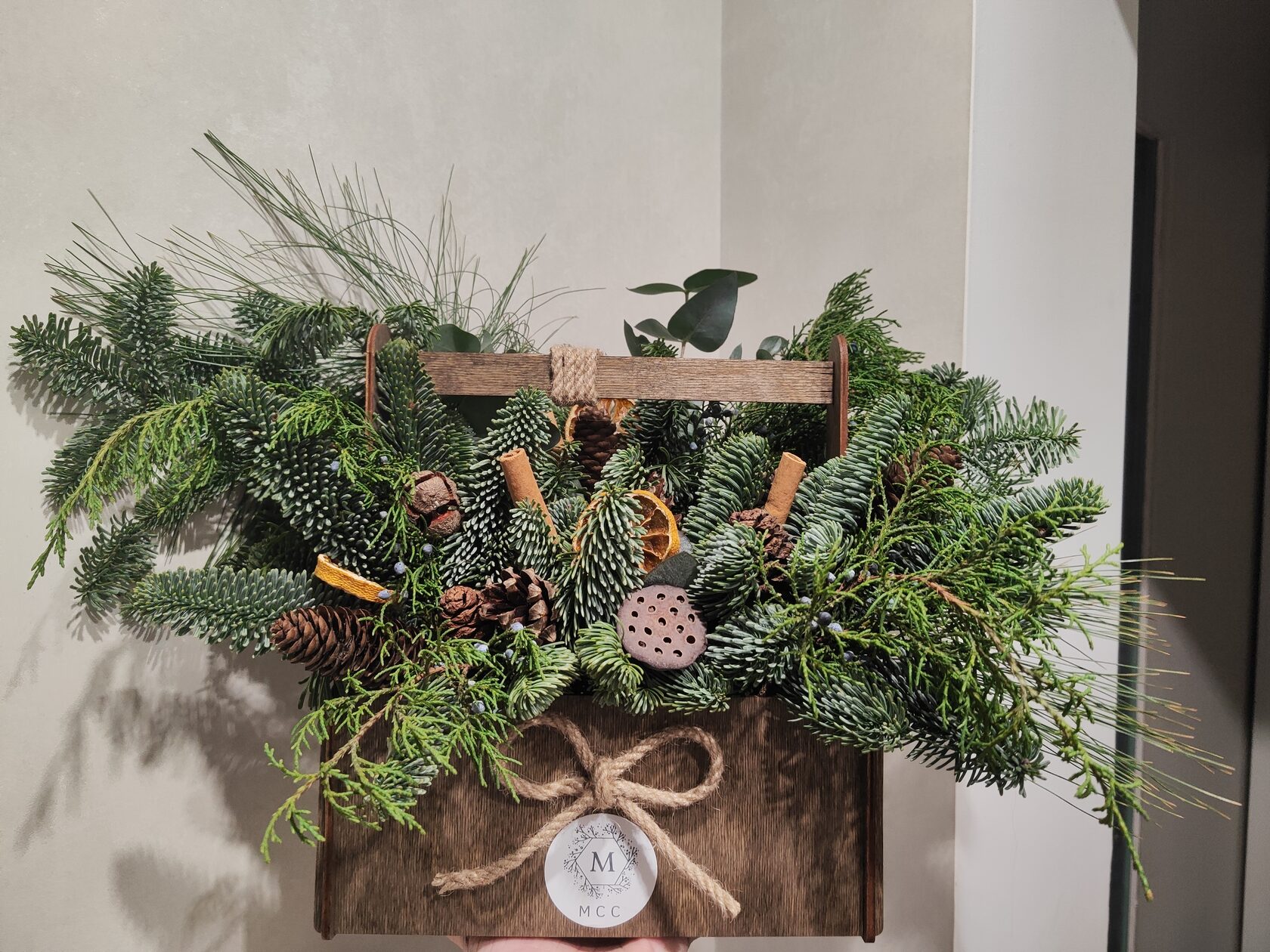 Композиция из веток нобилиса в деревянном ящике 45*45